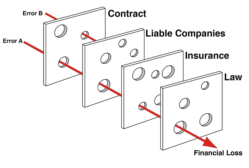 第三方机构很难保证永远值得信任。为了在中心化的世界中解决这个问题,我们使用多层级的保护:合同、责任公司、保险、法律……只要其中一个层级按照预想的起作用,正确性就可以得到保障。然而,如果所有层级都出现了问题,攻击就会成功(瑞士奶酪模型)。