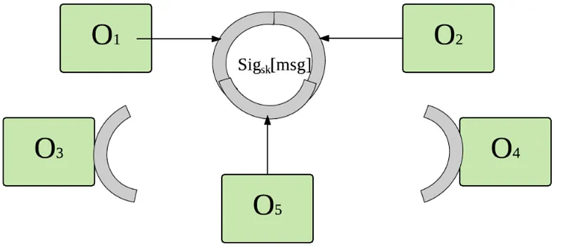ChainLink建议的解决方案是使用Schnorr签名:参与工作的每个预言机都会收到特定于该项工作的[公钥,私钥]组合。他们可以使用他们的私钥生成部分签名,其中包含他们对数据查询的解决方案(加密)。一个签名本身是不够的,但如果组合了足够的签名(如下图所示),它会产生一个集体签名,相当于单个事务中所有答案的聚合。